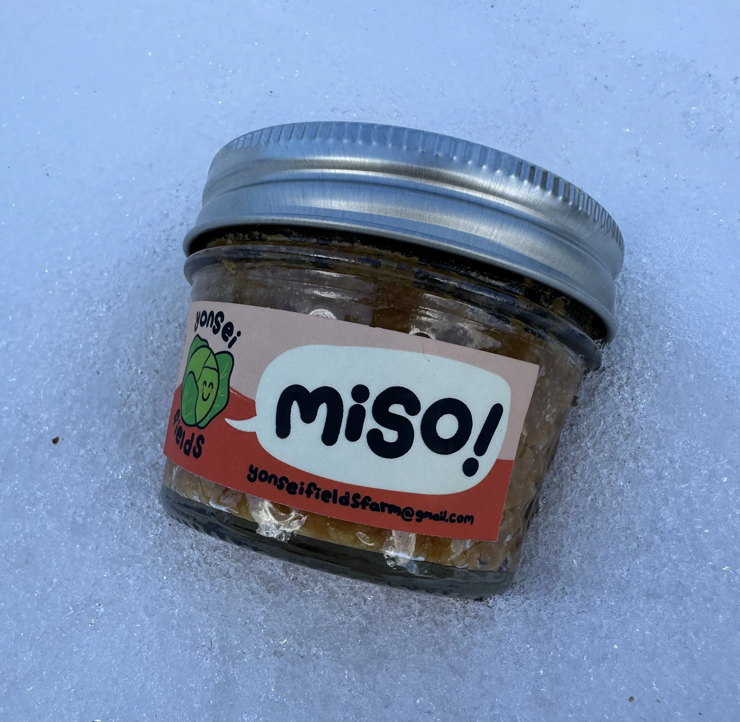 A jar of miso in the snow, made with Yonsei Fields soybeans and local koji.