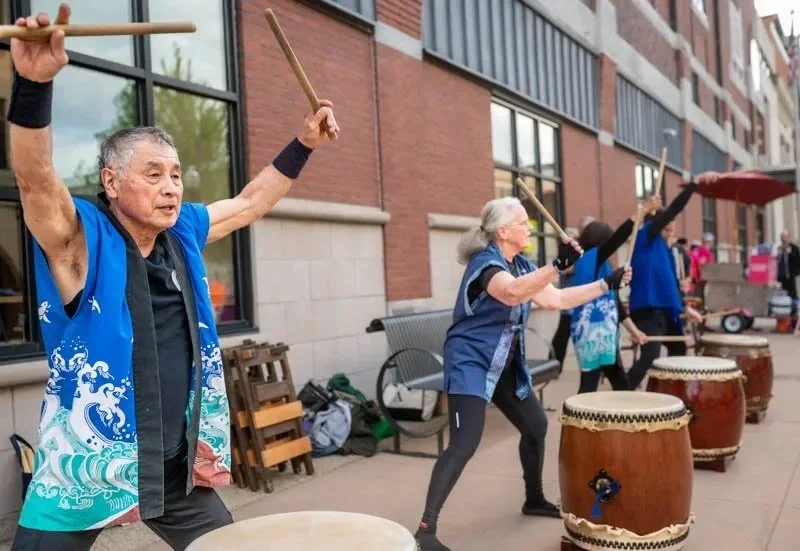 Toshi, on the left, participates Friday in a drumming performance presented by the Portland-based Taiko Maine Dojo Club